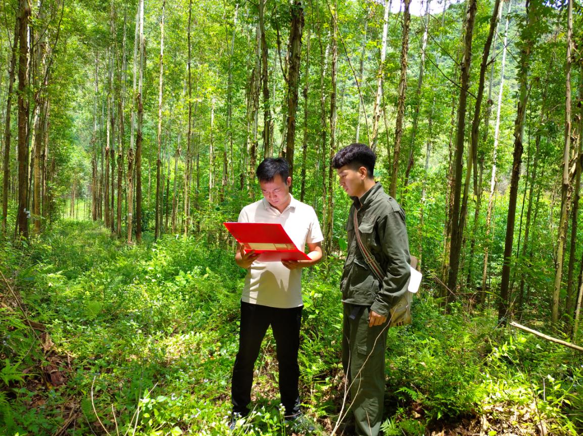 2021年7月8日,,,,,,总司理赵文东到鹿寨镇拉敢林地检查指导造林事情。。。。。。