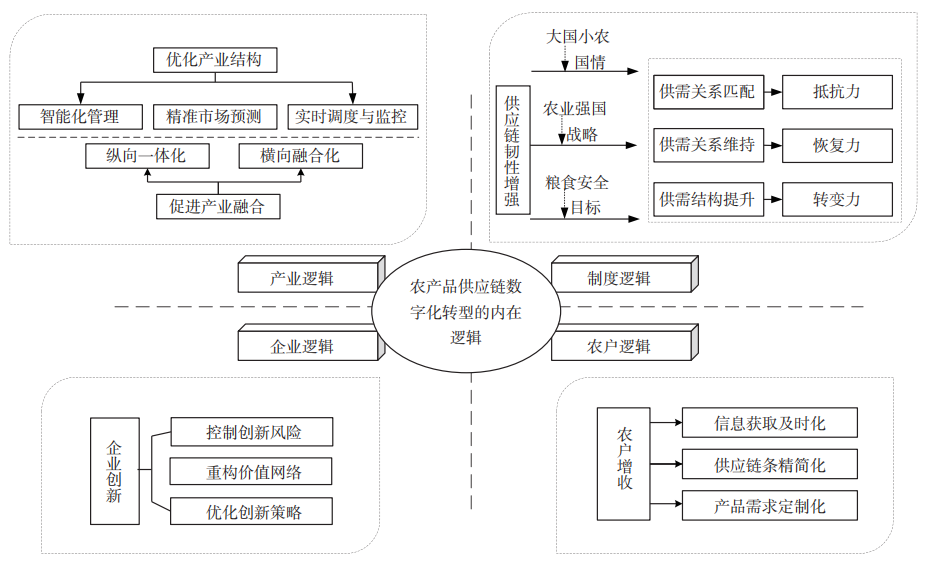 研究以技术嵌入和数字孪生理论为基础,重新界定“农产品供应链数字化转型”的概念内涵,基于“宏观政策环境—中观产业生态—微观主体行为”框架,从制度、产业、企业与农户逻辑,阐述农产品供应链数字化对增强供应链韧性、优化产业结构、促进企业创新和农户增收的重要意义。